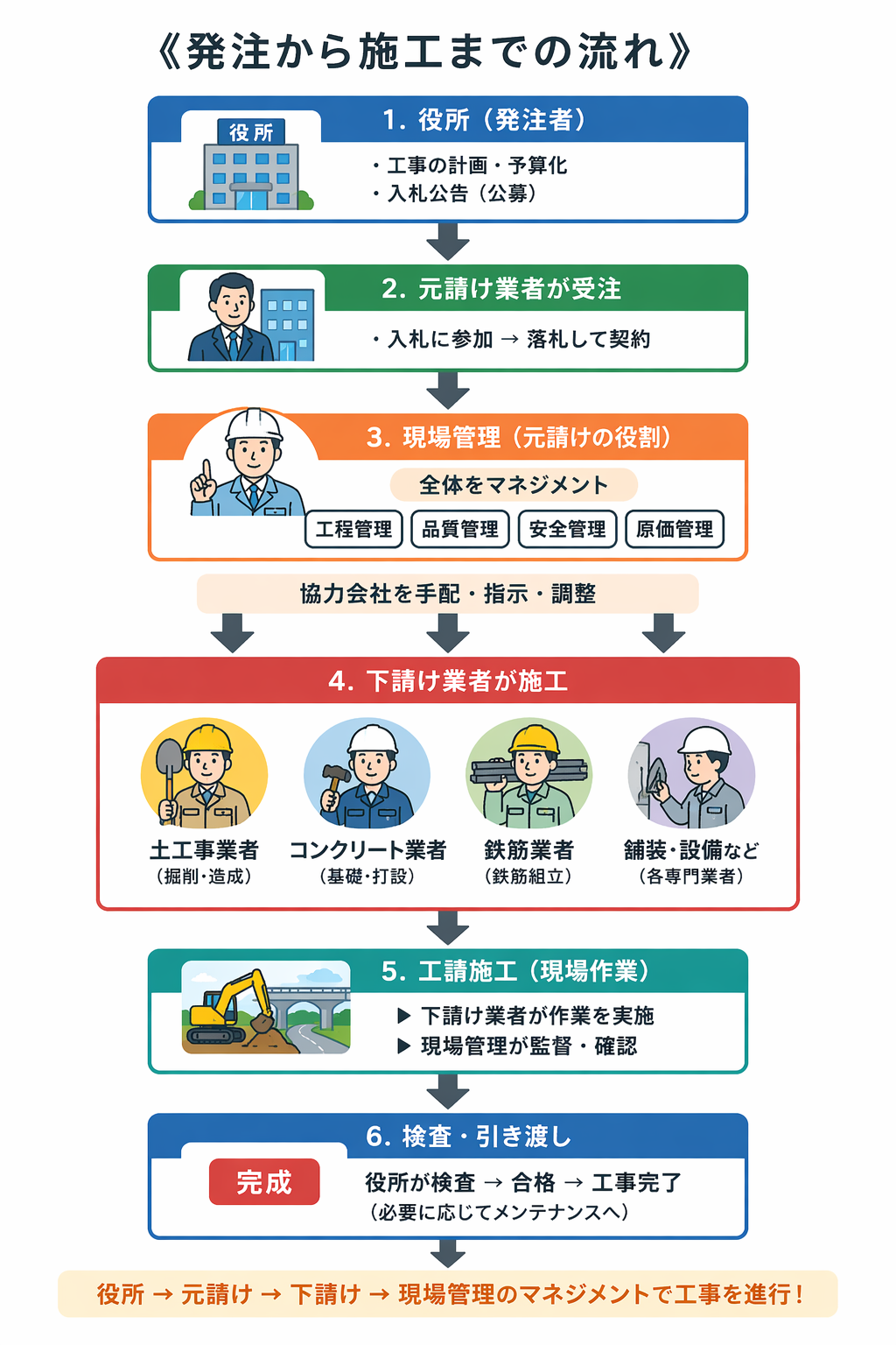 一般的な土木工事は、公共事業になるので、以下のような流れで受注します。
